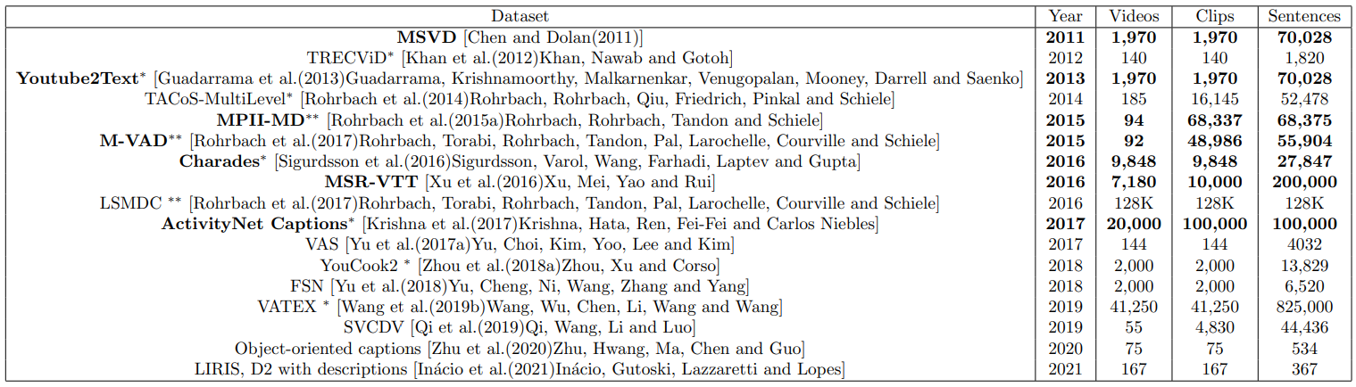 먼저 2016년부터 2021년까지의 Video Captiong을 Review한 논문 "Video Captioning: a comparative review of where we are and which could be the route" (2023-04)를 기반으로 기존 연구들에 대한 Video Captioning 연구의 목적과 방향을 정리한다.